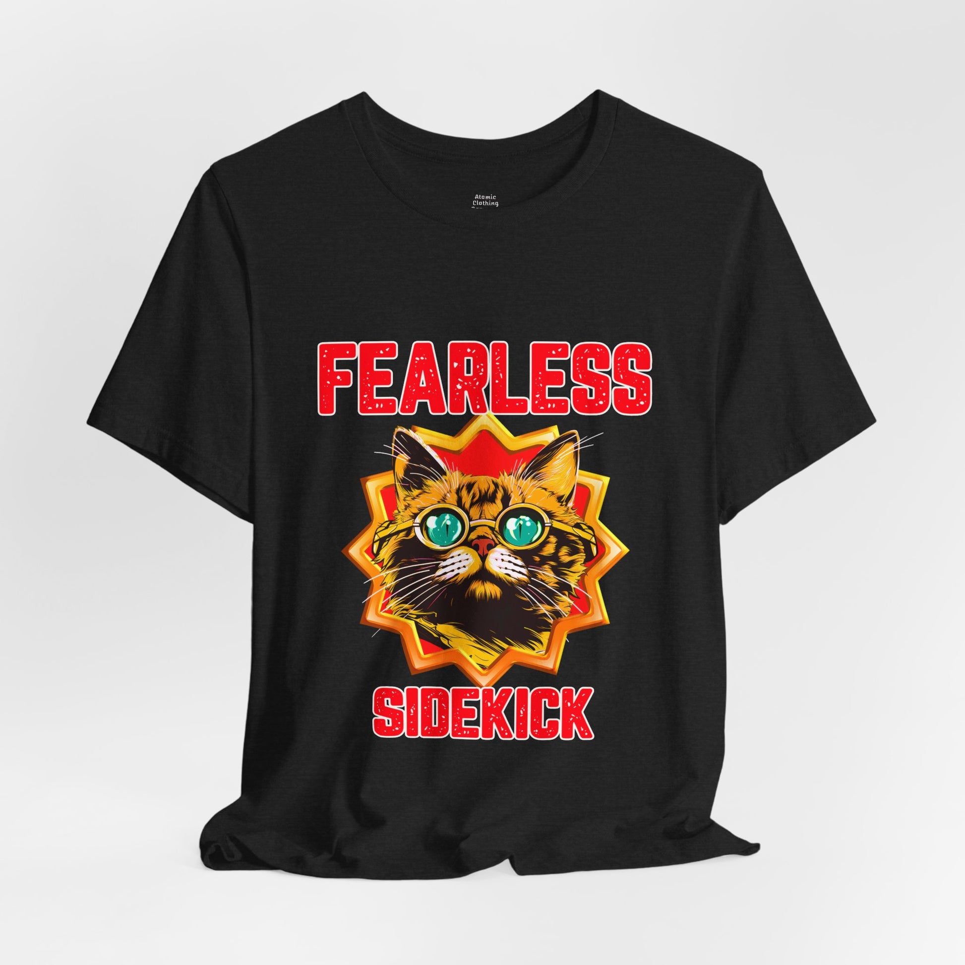 This relaxed crew-neck tee brings playful confidence to everyday wear. A boldly illustrated cat face bursts through a sunburst, framed by bright, vintage-inspired lettering that reads “FEARLESS” above and “SIDEKICK” below. The graphic has a slightly worn, retro arcade look that pops against the solid black fabric. Wear it on messy mornings, late-night hangouts, or low-key adventures — it reads as an anthem for anyone who prefers humor, loyalty, and a little attitude. Lightweight yet sturdy, the shirt drapes casually and layers easily under a jacket or over a long-sleeve for changing weather. It’s the kind of tee that starts conversations and becomes a regular in your rotation: nostalgic, a little mischievous, and unmistakably you. Product features - Twill shoulder tape for shape retention and reduced stretching - Tubular knit (no side seams) for cleaner lines and less waste - Ribbed knit collar without seam for lasting elasticity - Medium-weight 100% cotton fabric (5.3 oz/yd²) — comfortable and durable - DTG and DTF printed details for crisp, detailed graphics Care instructions - Non-chlorine: bleach as needed - Do not iron - Do not dryclean - Machine wash: cold (max 30C or 90F) - Tumble dry: low heat