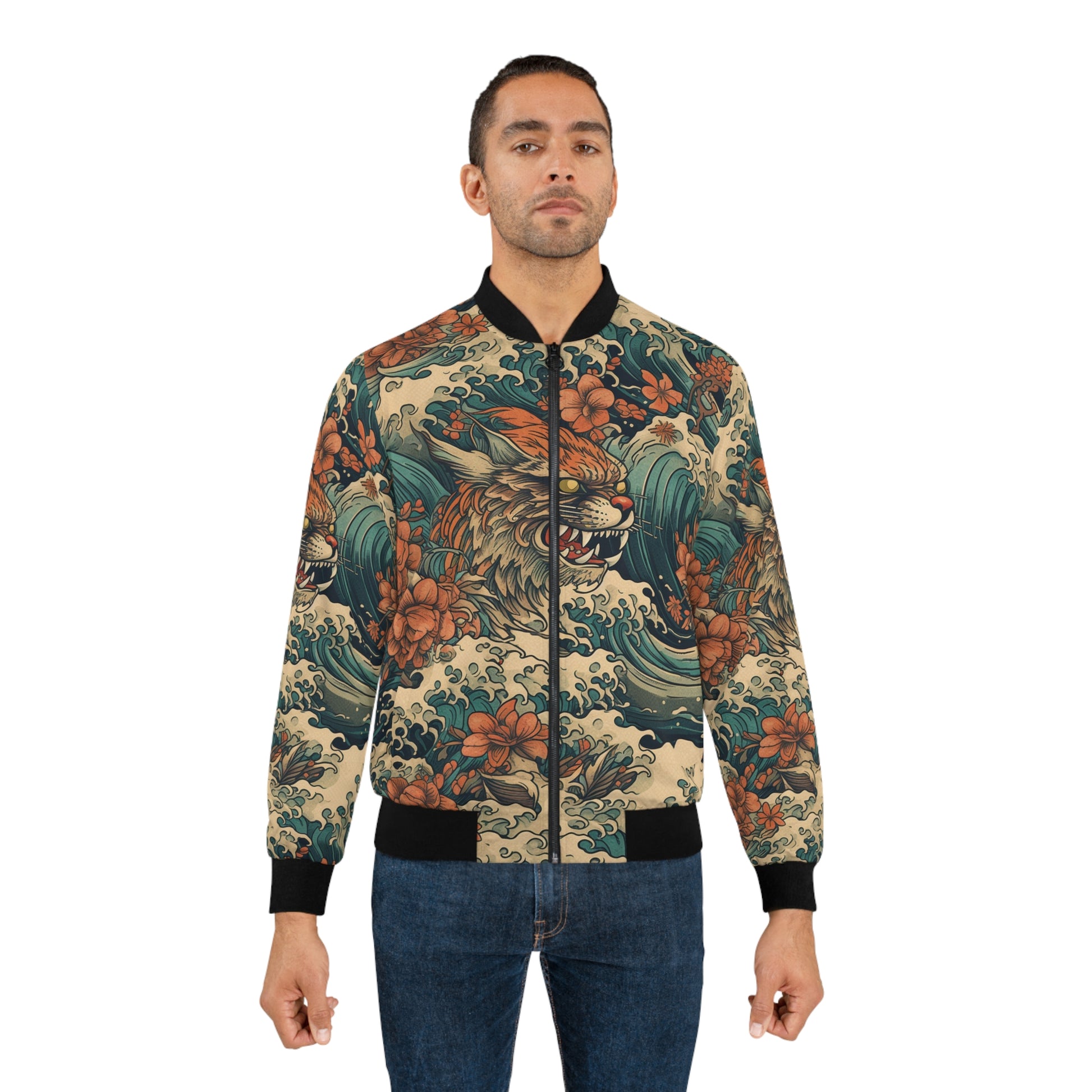 A striking all-over print bomber jacket that channels bold Japanese-inspired wave and koi motifs with a modern streetwear edge. The rich teal and rust palette wraps the jacket in energetic movement — crashing waves, blooming florals, and a fierce koi rendered with textured, hand-drawn detail. Lightweight yet durable polyester holds the print’s depth and color, while black rib-knit collar, cuffs, and hem ground the piece and give it a classic silhouette. Wear it to add dramatic, artful flair to casual outfits or to stand out at evening gatherings and creative events.