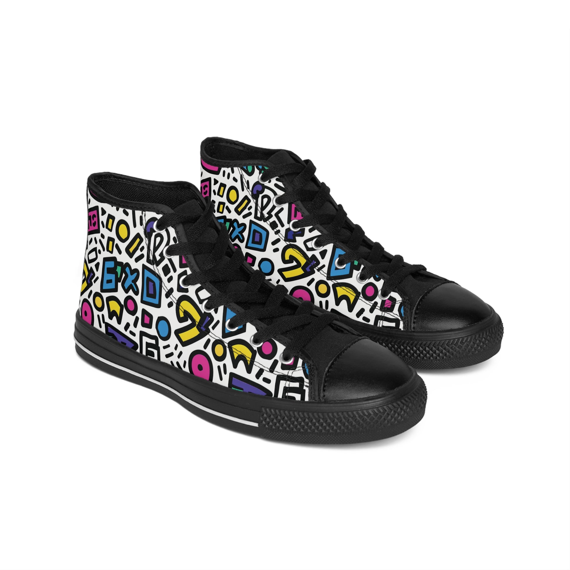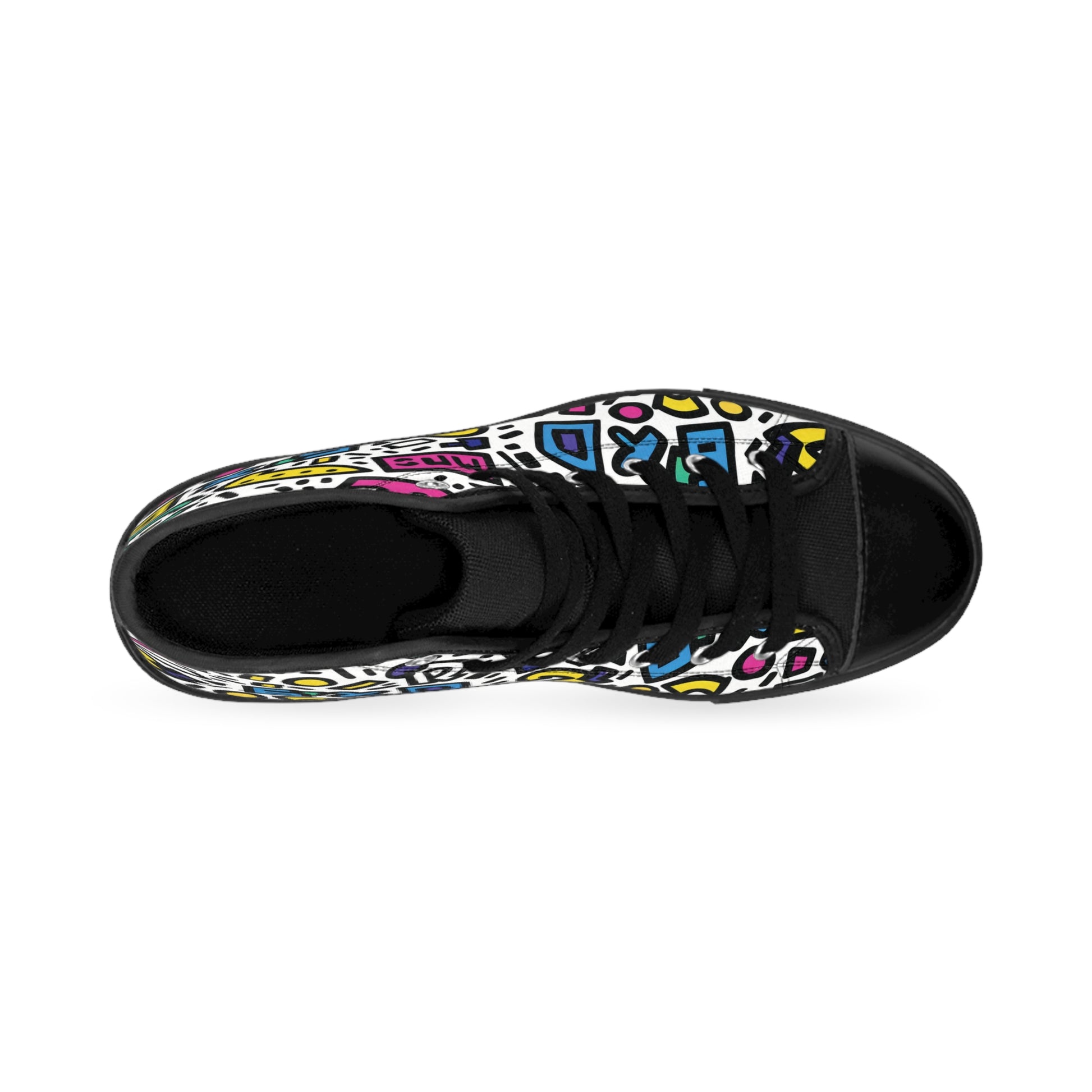 Bright, high-top sneakers that bring playful, retro energy to everyday wear. The bold doodle print - a mash of geometric shapes and squiggles in electric pink, teal, yellow and blue - pops against a crisp white background and black trim. Built on a durable rubber outsole and reinforced with a pleather toe cap, these sneakers balance eye-catching style with practical details: metal eyelets for smooth lacing, a cushioned foam insole for breathability and comfort, and a durable nylon canvas upper that holds its shape. They sit at a classic 5" calf height and come in standard US sizes 6–12. Wear them with cropped jeans, skirts, or your favorite streetwear pieces to add a joyful, creative spark to your look.